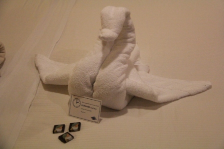 Returning to the room for the evening, we found a swan, three chocolates, and a reminder about turning the clock ahead an hour.